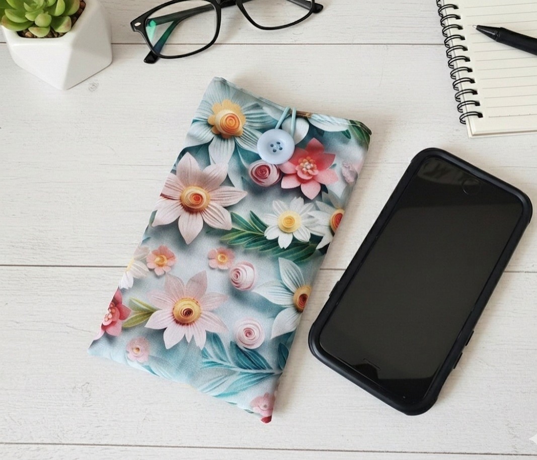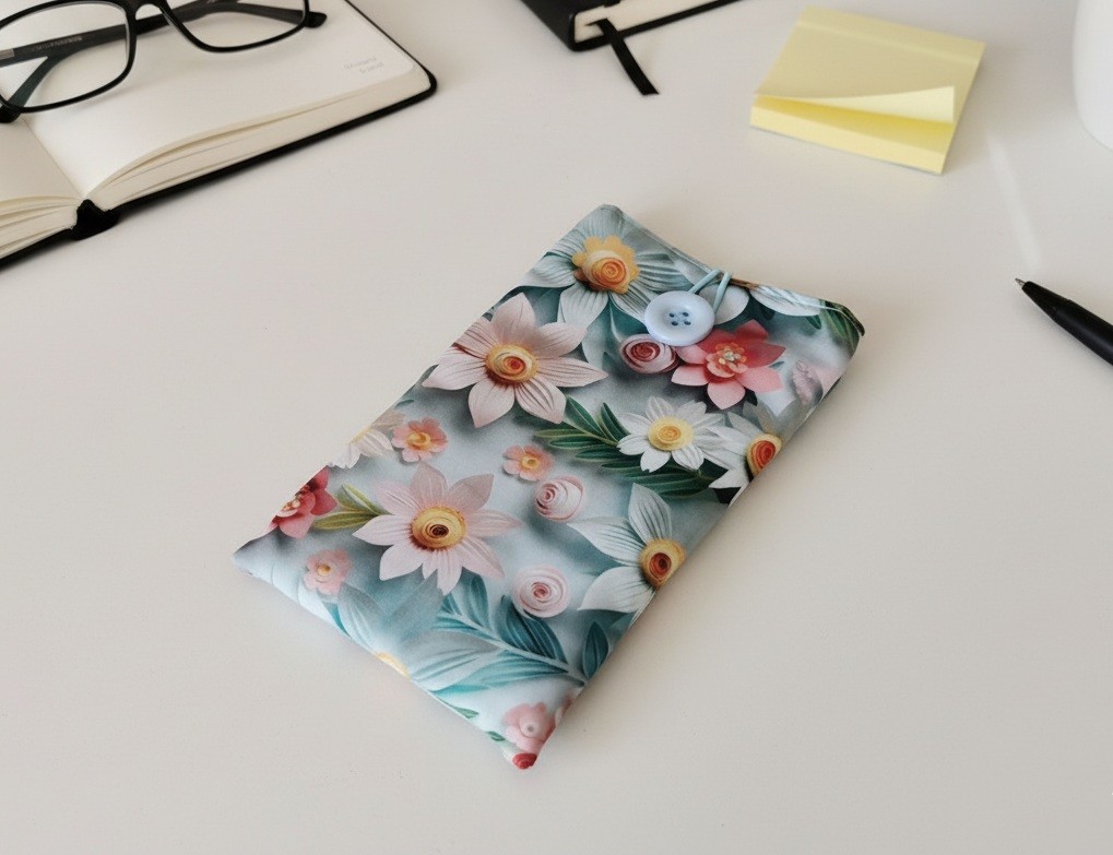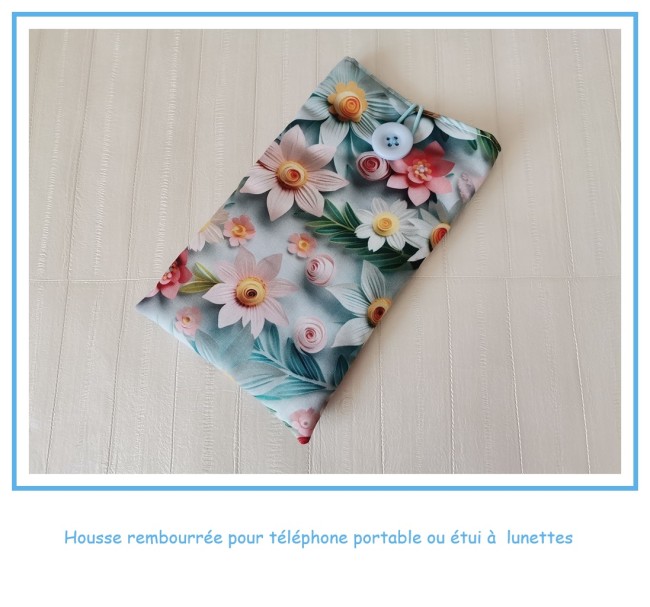 Elle est composée d'un tissu extérieur en coton imprimé effet 3D fleurs, un tissu intérieur en coton uni vert pale et doublée d'une fine ouate pour une meilleure protection de votre téléphone ou de vos lunettes. Fermeture par bouton avec élastique