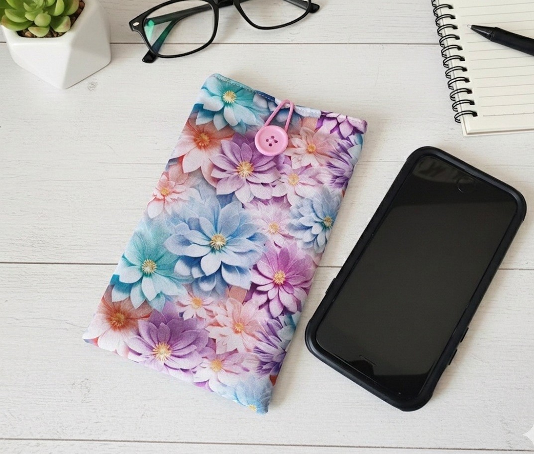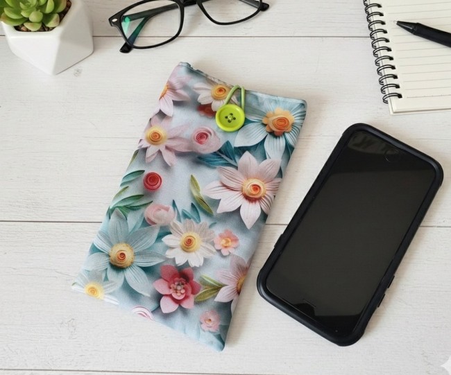 Elle est composée d'un tissu extérieur en coton imprimé effet 3D fleurs, un tissu intérieur en coton uni lilas et doublée d'une fine ouate pour une meilleure protection de votre téléphone ou de vos lunettes. Fermeture par bouton avec élastique