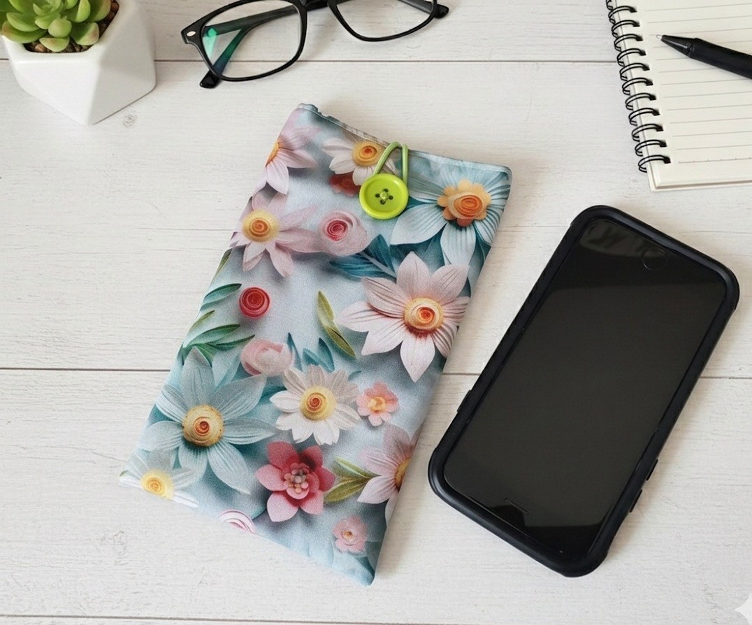 Elle est composée d'un tissu extérieur en coton imprimé effet 3D fleurs, un tissu intérieur en coton uni vert pale et doublée d'une fine ouate pour une meilleure protection de votre téléphone ou de vos lunettes. Fermeture par bouton avec élastique