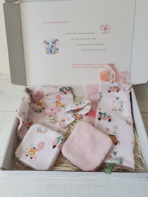 Coffret naissance/box naissance bavoir, attache tétine, doudou et 8 lingettes