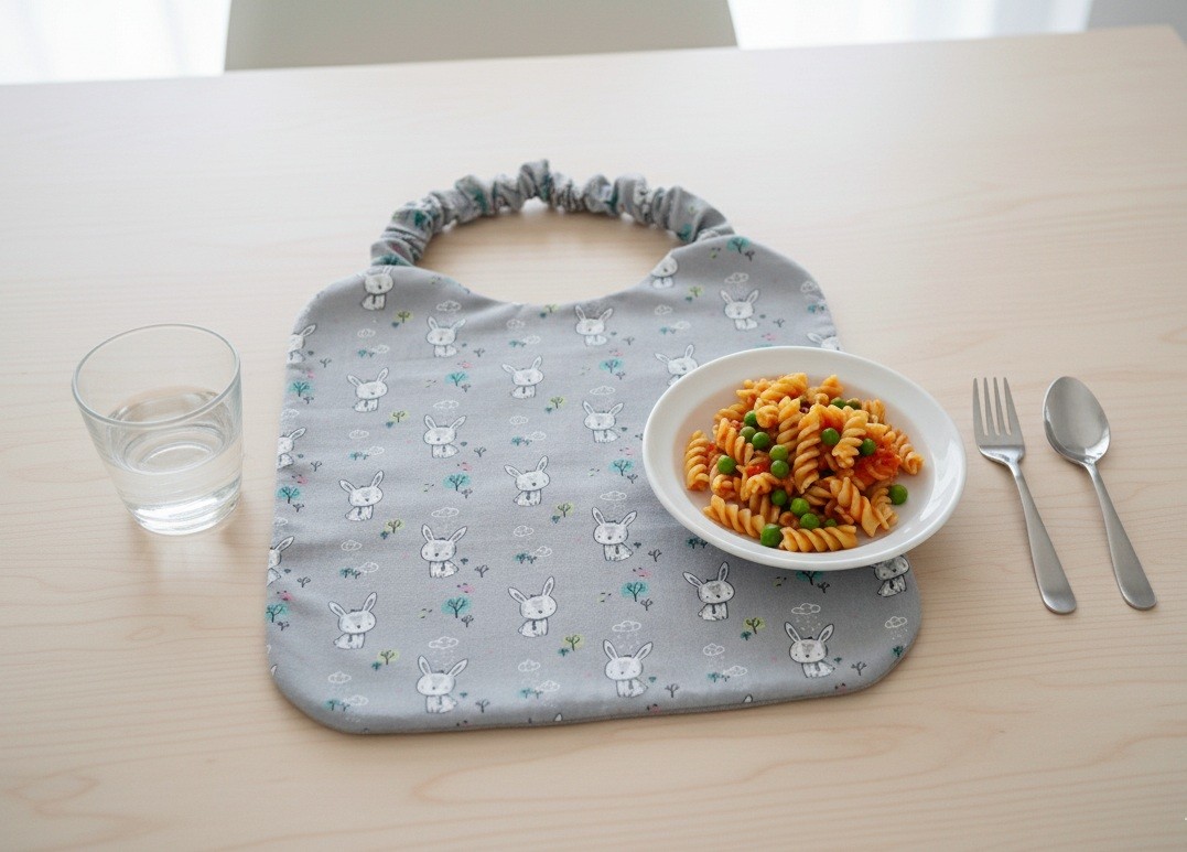 Réalisé en tissu coton certifié Oeko-Tex imprimé lapin blanc et doublée tissu nid d'abeilles bleu pale