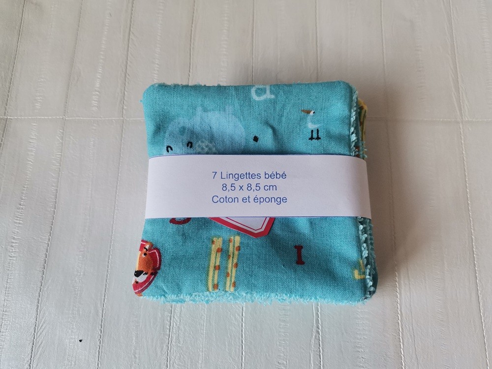 Une face coton certifié Oeko-Tex motifs animaux et lettres et l'autre face en tissu éponge de couleur bleue