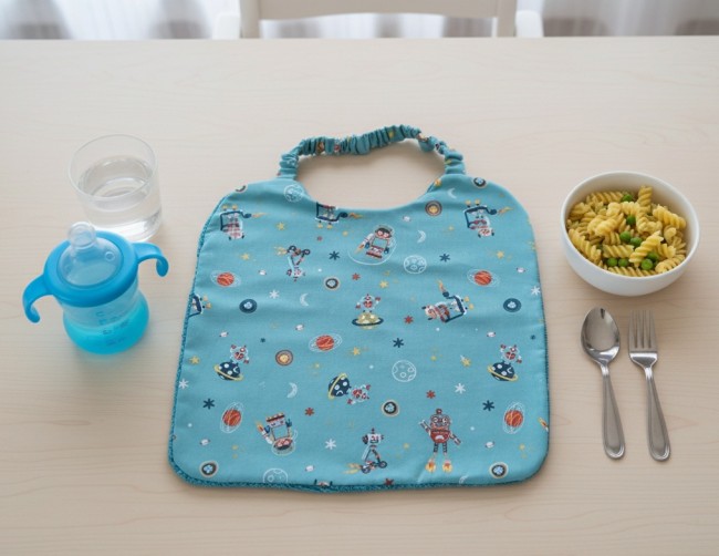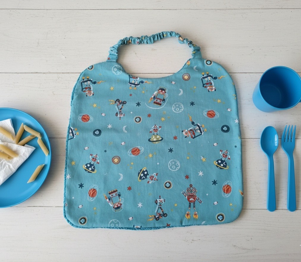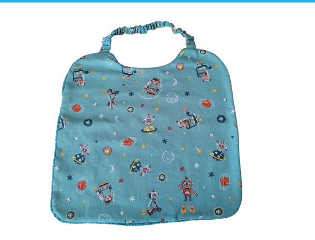 Réalisé en tissu coton certifié Oeko-Tex imprimé robots et doublée tissu éponge bleu turquoise