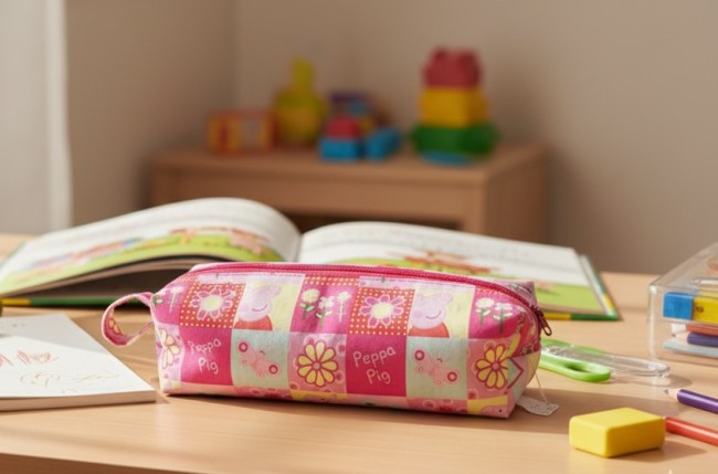 Trousse zippée en coton certifié Oeko-Tex motif fusées intérieur doublé d'un tissu coton de couleur vert foncé - Entoilage de renfort pour le tissu principal et tissu doublure - Fermeture zippée de couleur verte