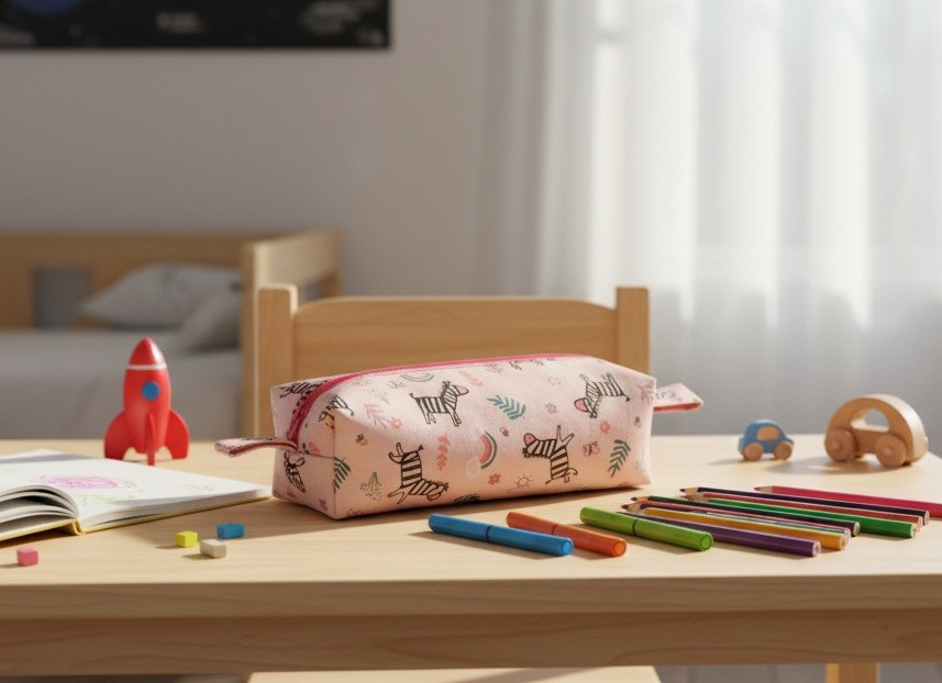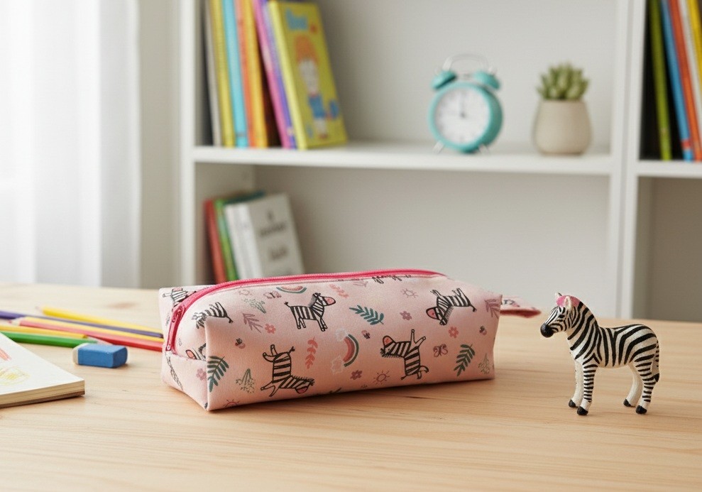 Trousse zippée en coton certifié Oeko-Tex motif zèbres intérieur doublé d'un tissu coton peigné de couleur saumon foncé - Entoilage de renfort pour le tissu principal et tissu doublure - Fermeture zippée de couleur saumon foncé