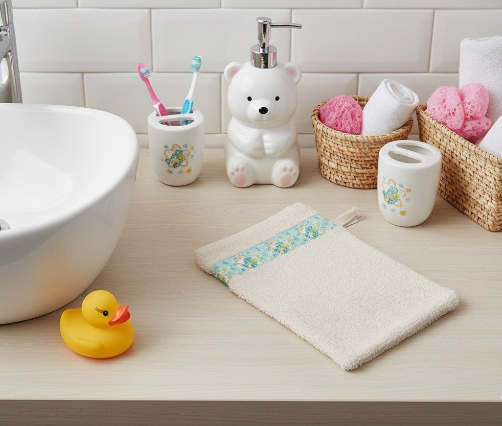 Gant de toilette bébé en éponge de couleur beige de taille idéal pour les petites mains de vos enfants avec un ruban motifs oursons et une petite dragonne