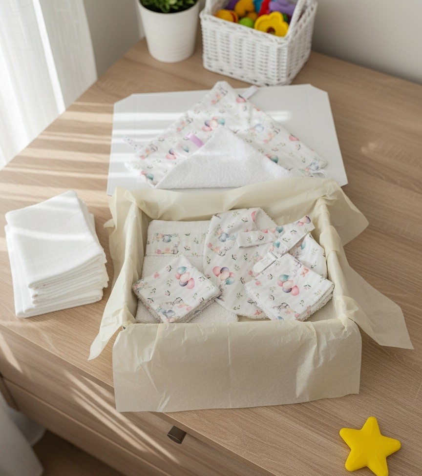 - sept lingettes toutes douces en coton certifié Oeko-Tex et éponge blanche pour la toilette de bébé ( format 9 x 9 cm )