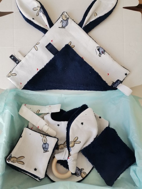 - 8 lingettes toutes douces en coton peigné motifs lapins et éponge bambou bleu marine pour la toilette de bébé ( format 9 x 9 cm )