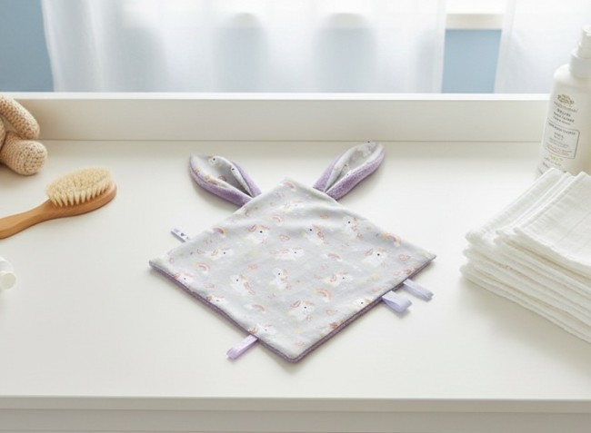 Réalisé avec du tissu double gaze de couleur blanche imprimé feuilles et doublé avec un tissu éponge bambou de couleur bleue