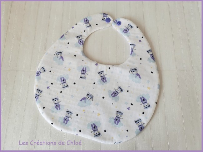 Ce joli petit bavoir se ferme par un bouton pression en résine de couleur violet