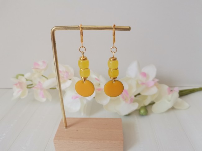 Boucles d'oreilles acier inoxydable dorées et sequin émail jaune orangé