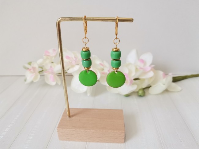 Boucles d'oreilles acier inoxydable dorées et sequin vert