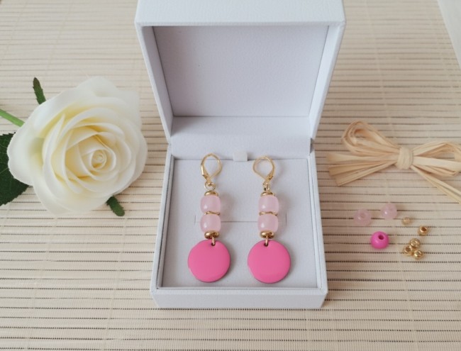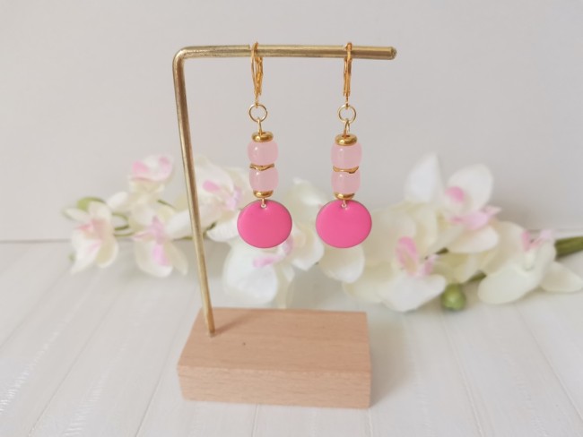 Boucles d'oreilles acier inoxydable dorées et sequin rose vif