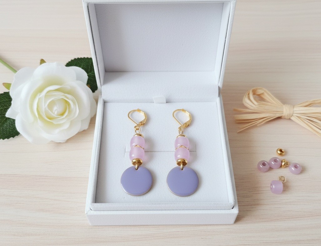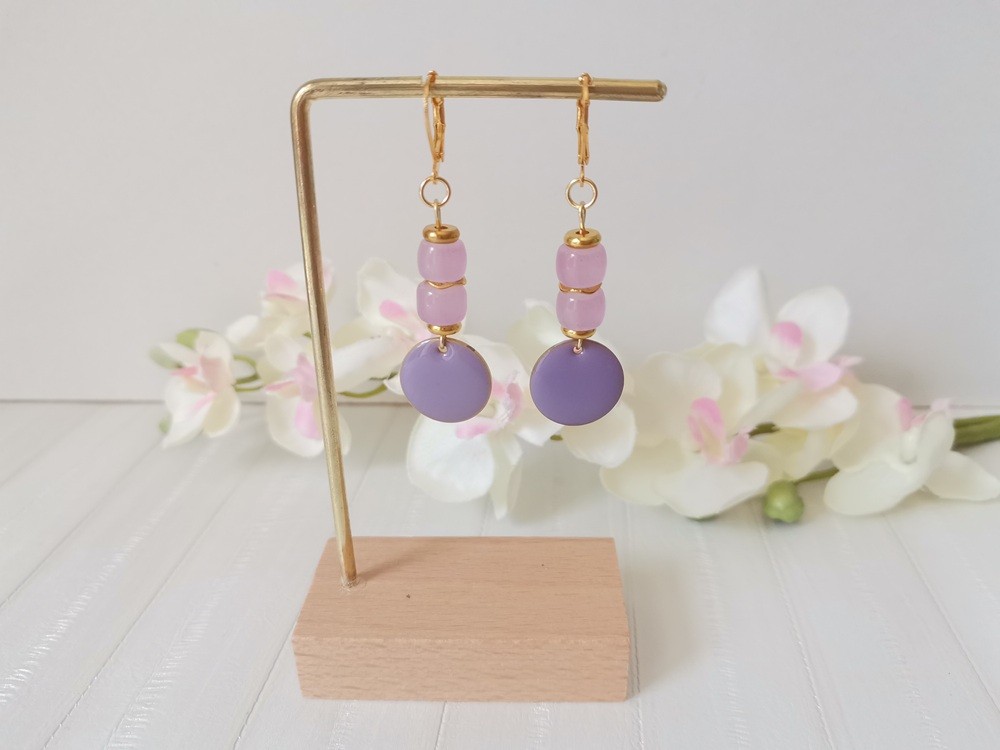 Boucles d'oreilles acier inoxydable dorées et sequin émail lilas