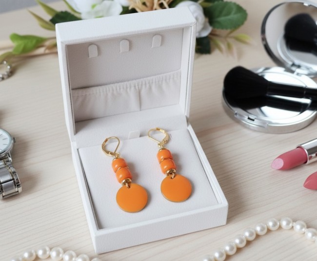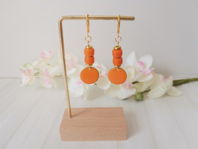 Boucles d'oreilles acier inoxydable dorées et sequin émail orange
