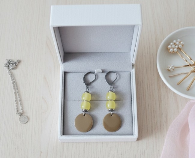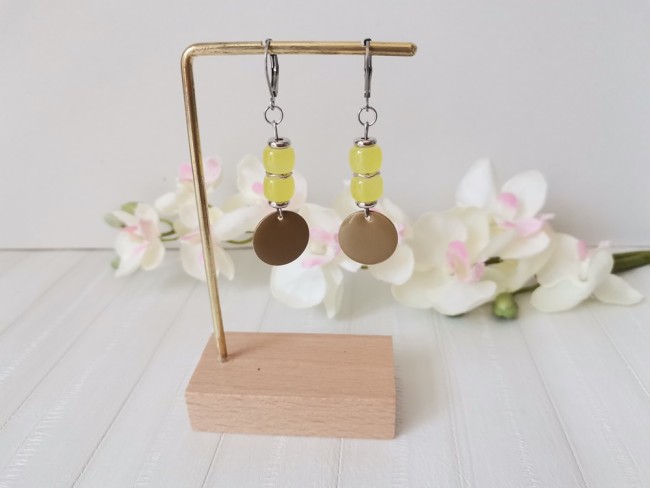 Elles sont composées de perles en verre colonne de 8 mm et d'un sequin émail de 15 mm