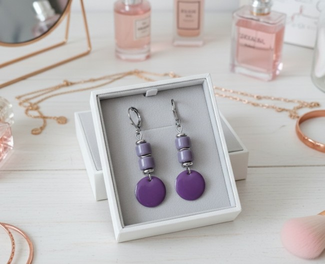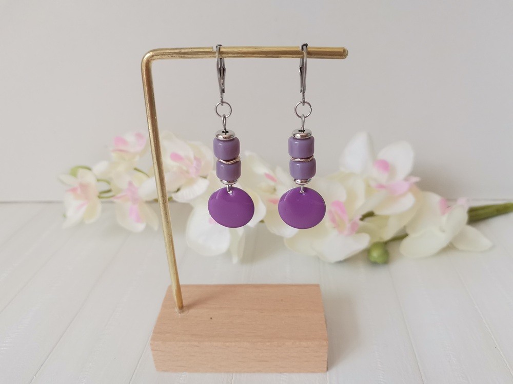 Boucles d'oreilles acier inoxydable et sequin émail violet