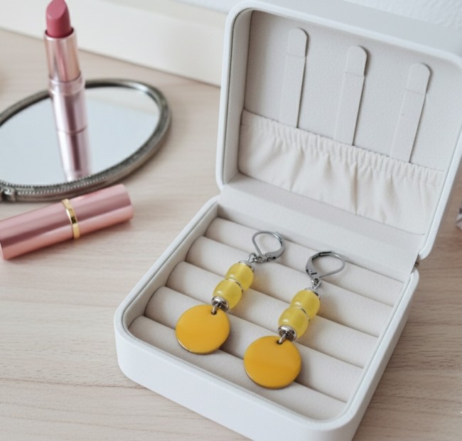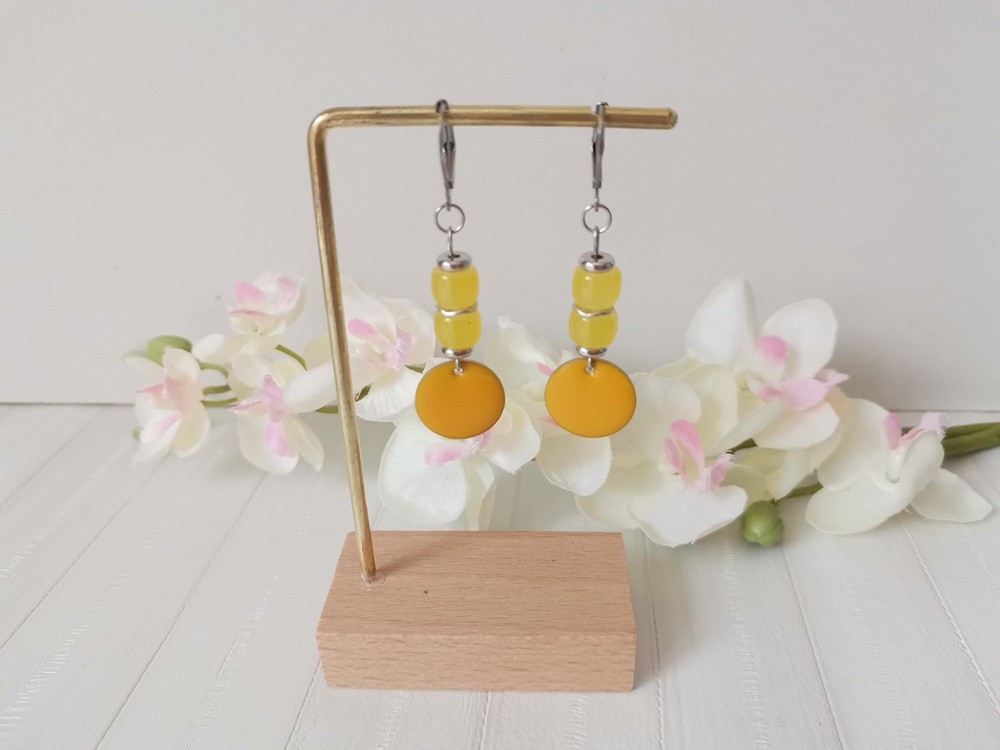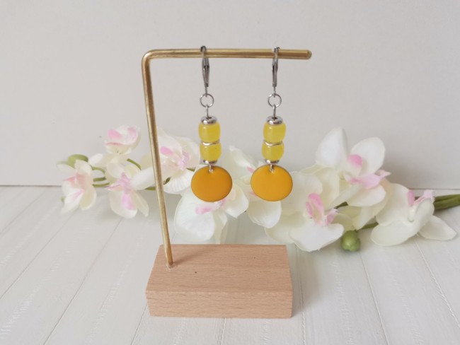 Boucles d'oreilles acier inoxydable et sequin émail jaune orangé