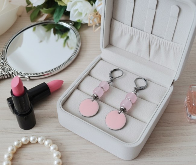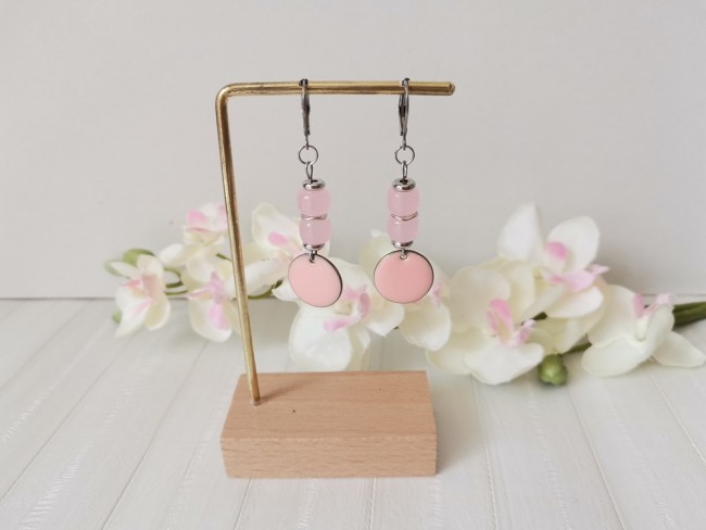 Boucles d'oreilles acier inoxydable et sequin émail rose clair