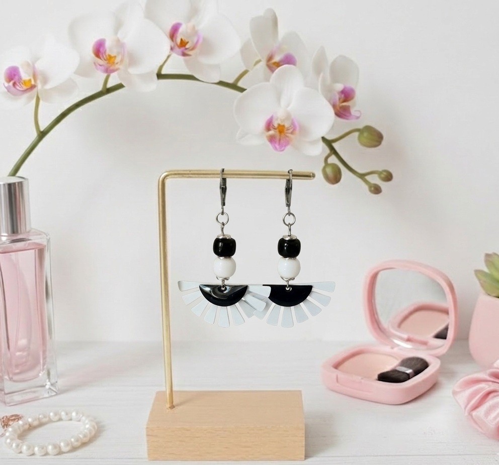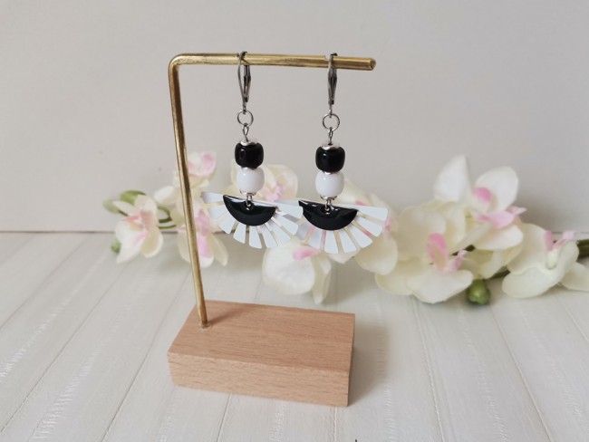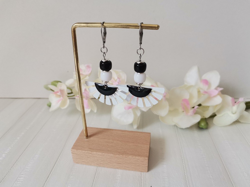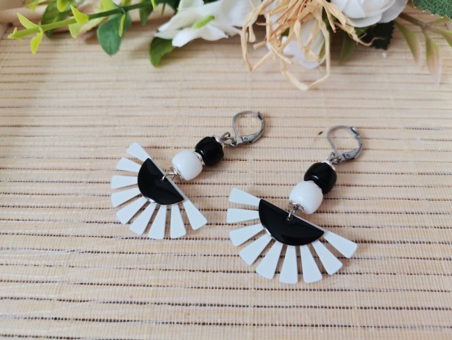Boucles d'oreilles acier inoxydable (dormeuse, perles intercalaire rondelle, tige et anneaux) avec grand pendentif fer blanc, pendentif demi lune en émail et perles en verre colonne noire et blanche.