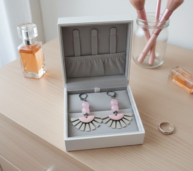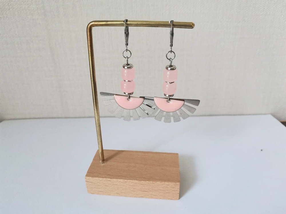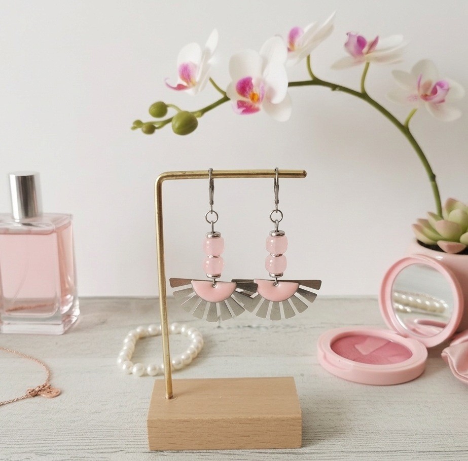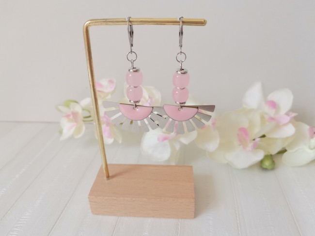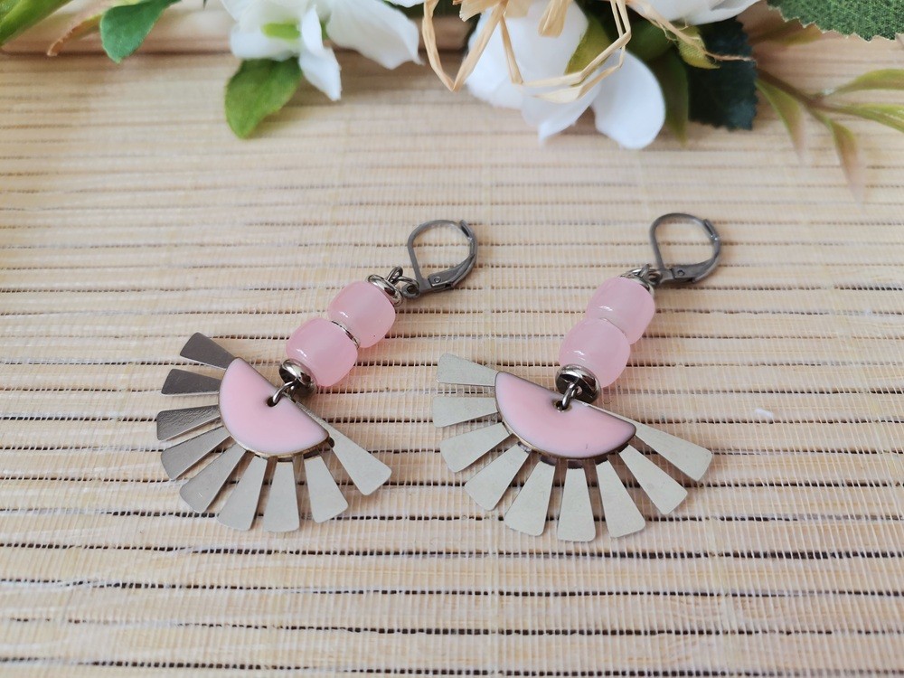 Boucles d'oreilles en acier inoxydable (dormeuse à levier, perles intercalaires rondelles, tige et anneaux) avec perles en verre colonne 8 mm rose, pendentif éventail acier inoxydable et sequin demi lune émail rose
