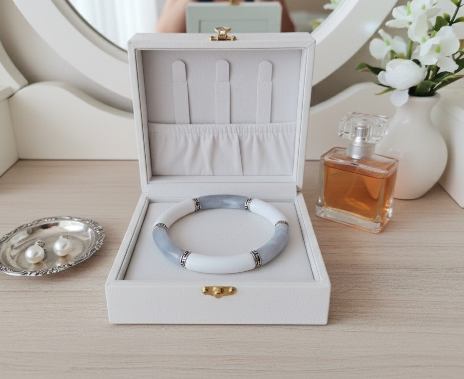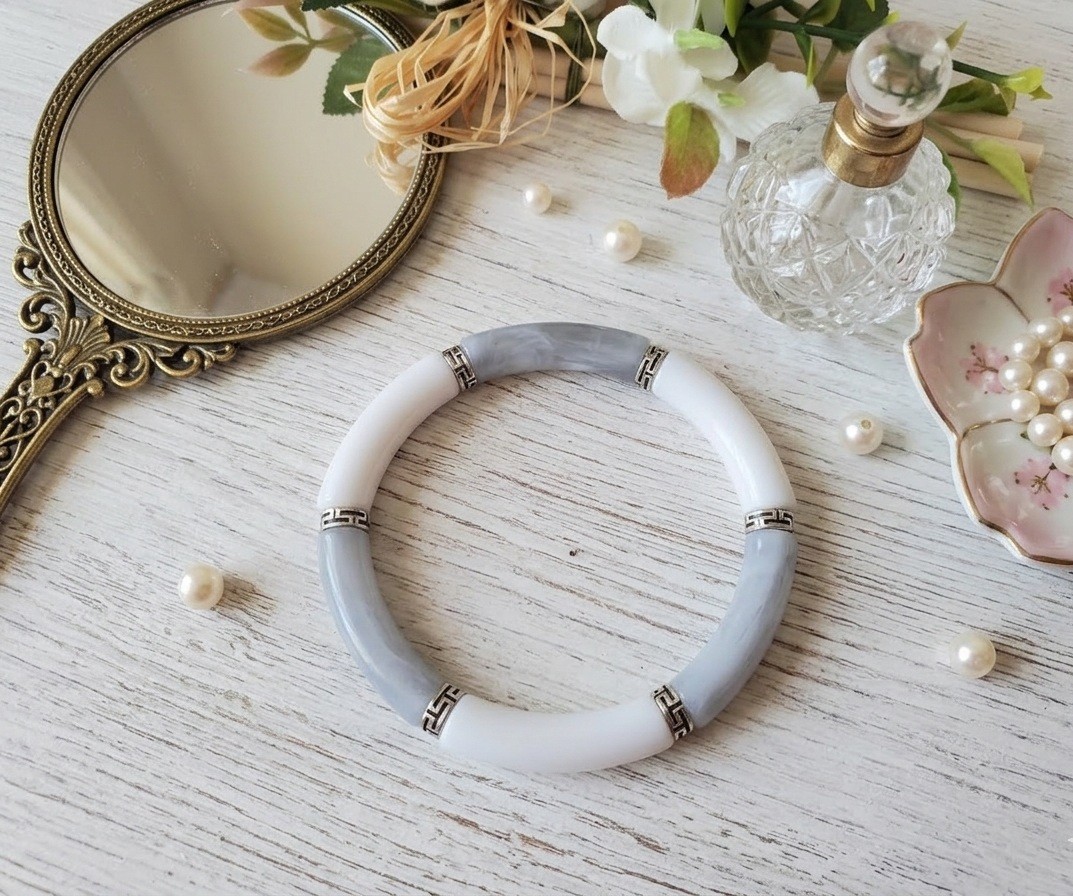 Bracelet sur fil élastique avec perles tubes incurvées et perles métal intercalaires 8 mm de couleur argent mat