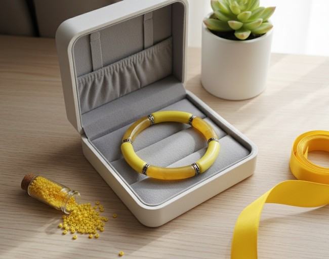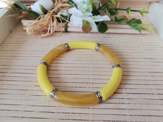 Bracelet perles tube incurvées couleur jaune et moutarde