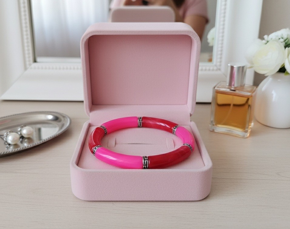 Bracelet perles tube incurvées couleur rouge et rose vif