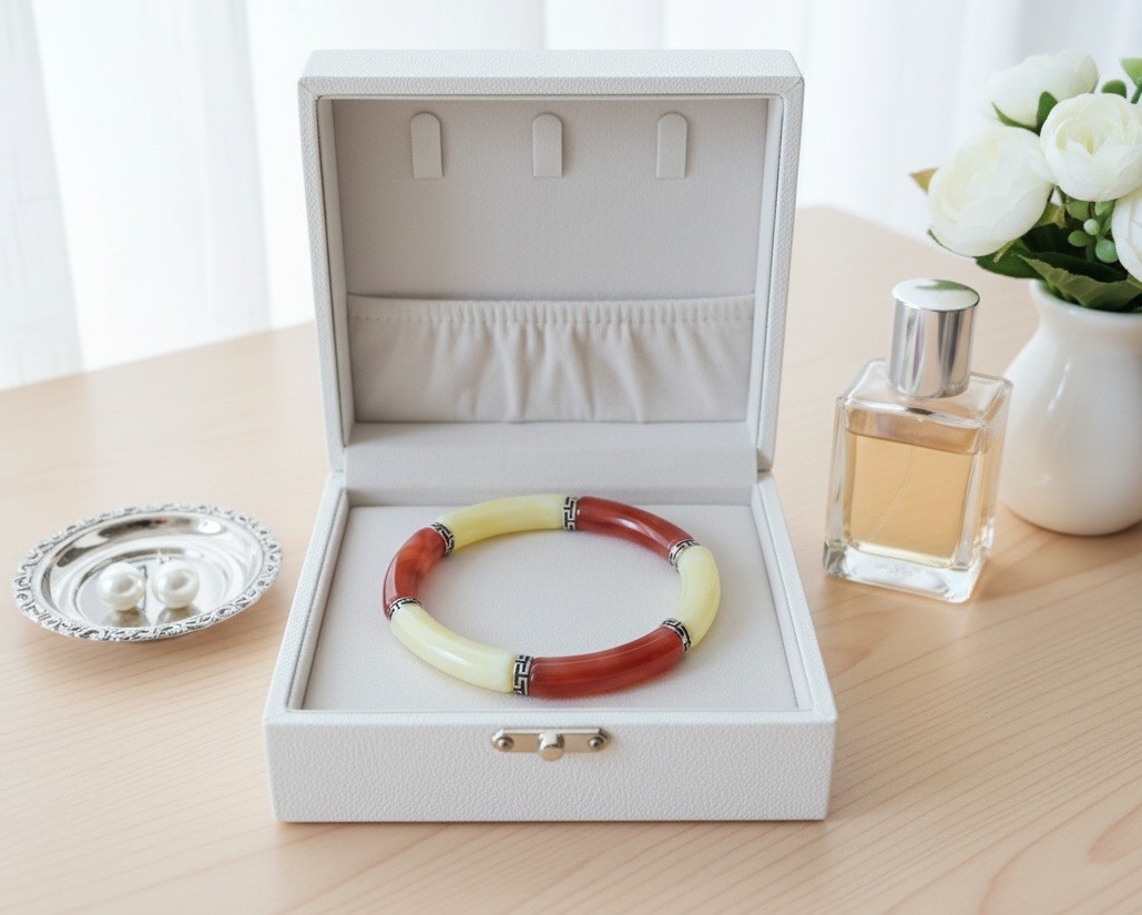 Bracelet perles tube incurvées couleur jaune pale et marron clair