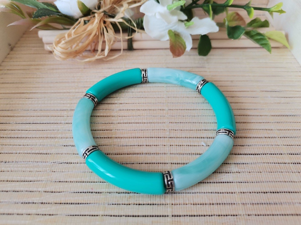 Bracelet perles tube incurvées couleur vert vif et turquoise