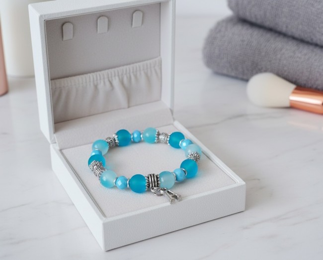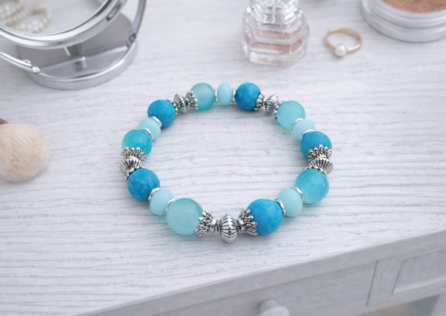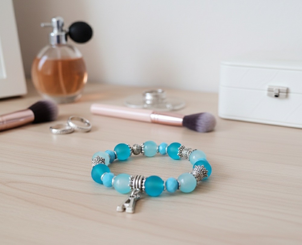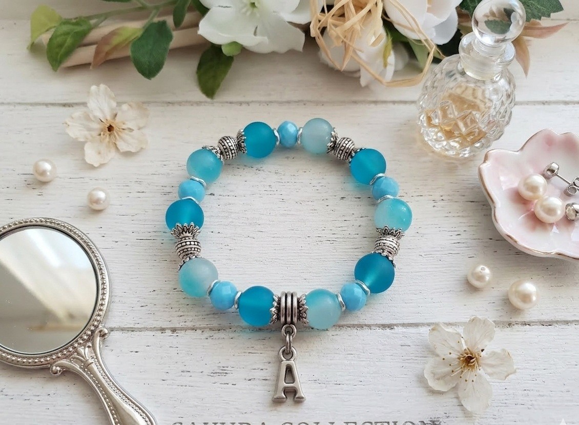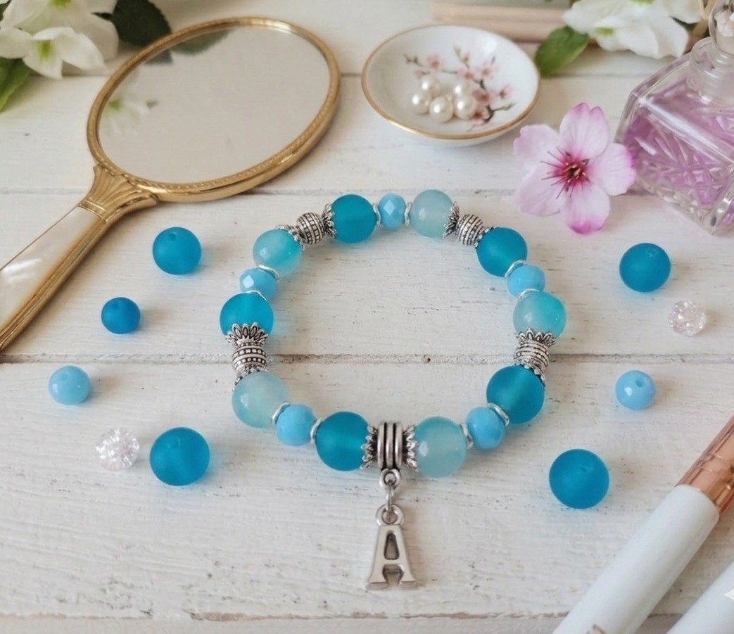 * Détail : bracelet sur fil élastique avec perles en verre givré bleu de 10 mm, perles en verre imitation jade bleu de 10 mm, perles à facette bleues 8 mm avec apprêts de couleur argent mat et breloque alphabet (suivant l'initial du prénom)