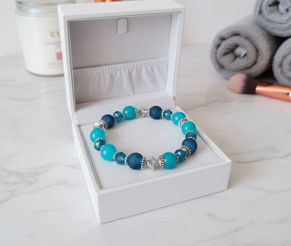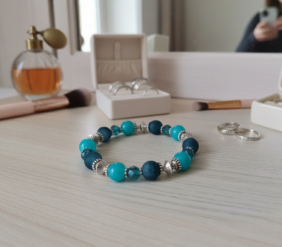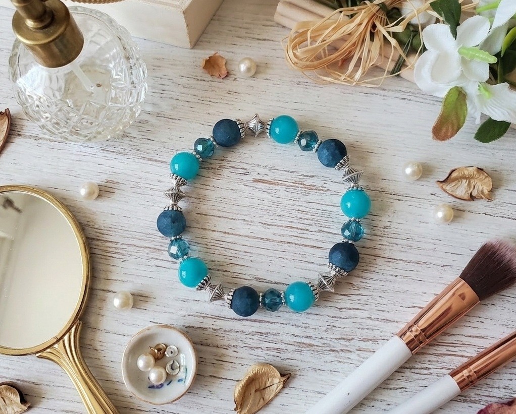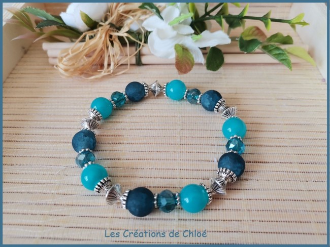 * Détail : bracelet sur fil élastique avec perles en verre givré bleu de 10 mm, perles en verre imitation jade bleu de 10 mm, perles à facette bleues 8 mm avec apprêts de couleur argent mat