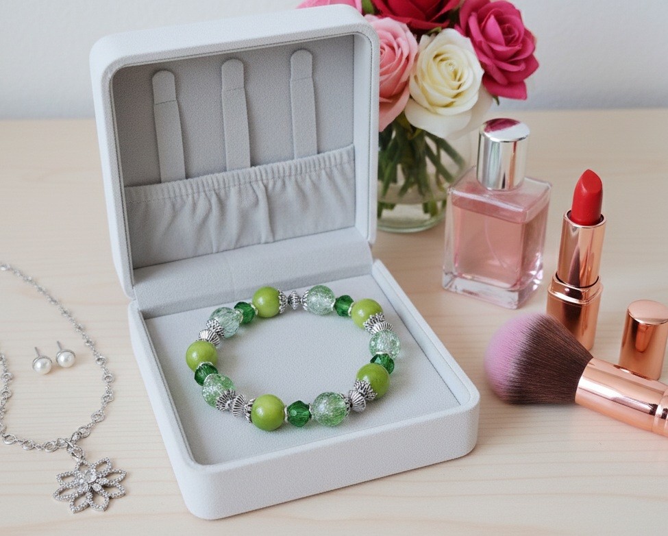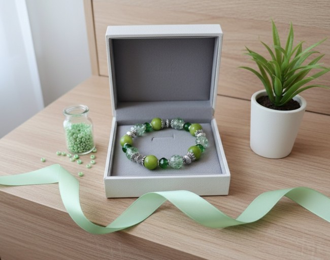 Bracelet fil élastique perles verre craquelé et jade verte