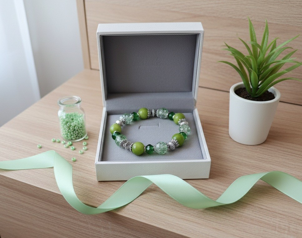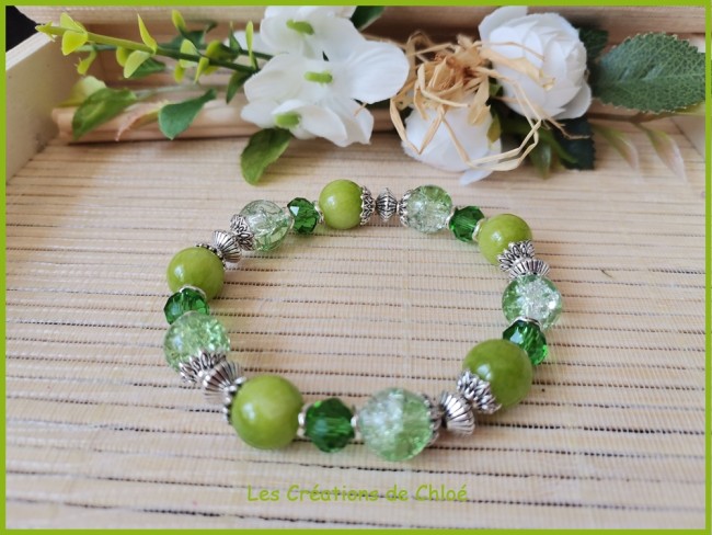Bracelet sur fil élastique avec perles en verre craquelé et jade de couleur verte et apprêts de couleur argent mat