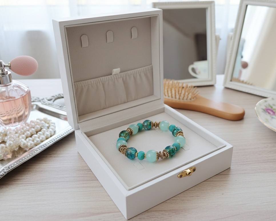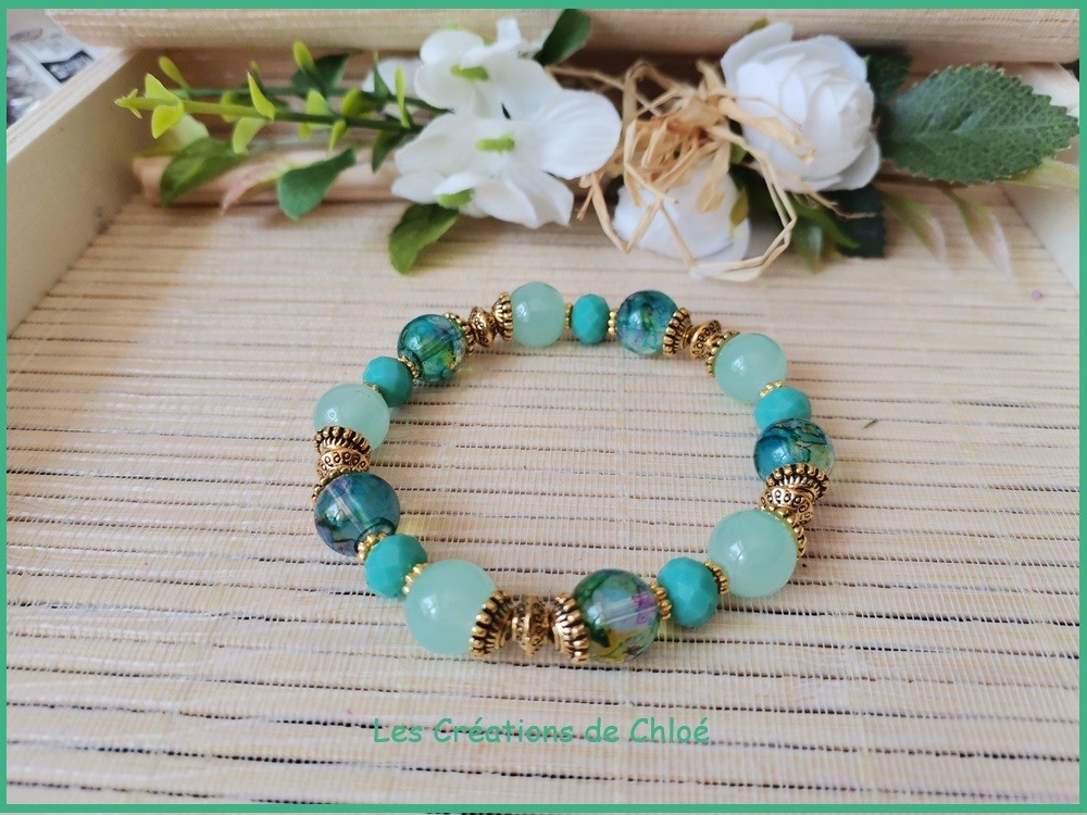 Bracelet sur fil élastique avec perles en verre et jade de couleur verte et apprêts de couleur doré