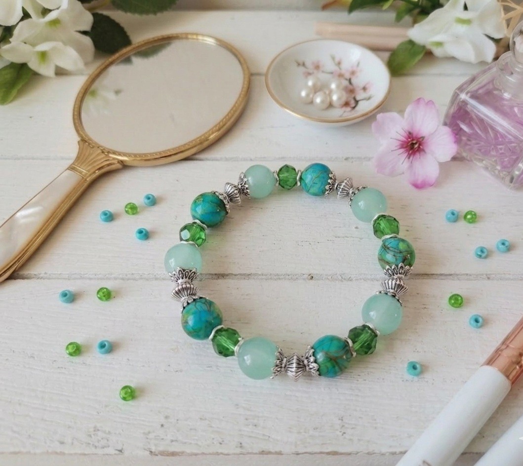 Bracelet sur fil élastique avec perles en verre tréfilé et imitation jade de couleur verte pale et apprêts de couleur argent mat