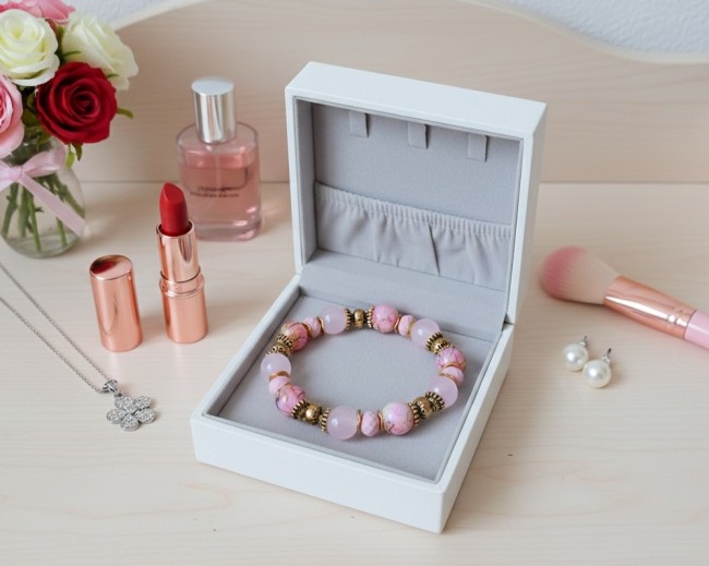Bracelet fil élastique perles verre et jade rose clair