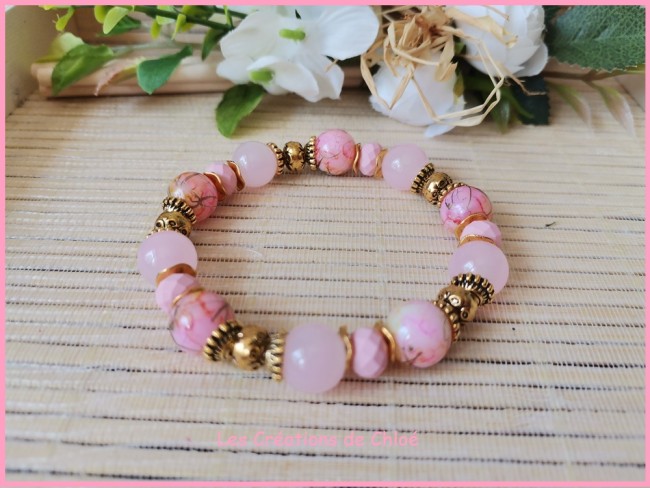 Bracelet sur fil élastique avec perles jade de couleur rose et apprêts de couleur doré