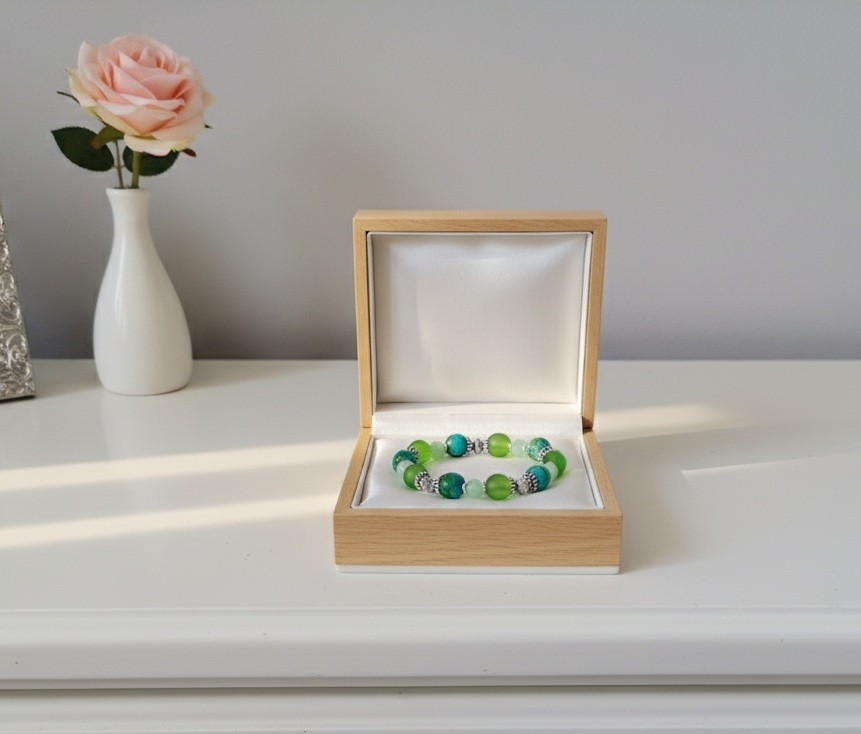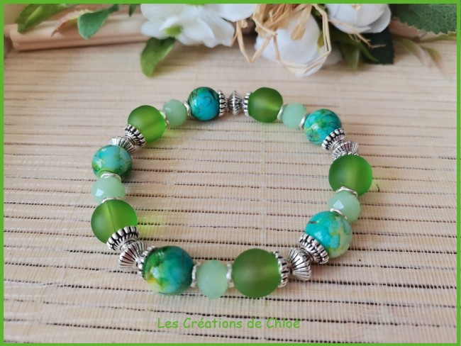 Bracelet sur fil élastique avec perles en verre givré et jade de couleur verte et apprêts de couleur argent mat