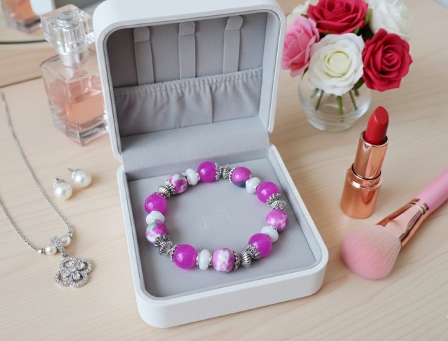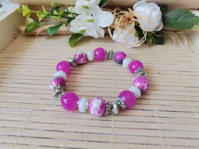 Bracelet sur fil élastique avec perles en verre imitation jade de couleur fuchsia, perles jade blanche et fuchsia et apprêts de couleur argent mat