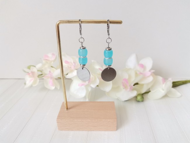 Boucles d'oreilles acier inoxydable, sequin métal et perles colonnes bleu ciel