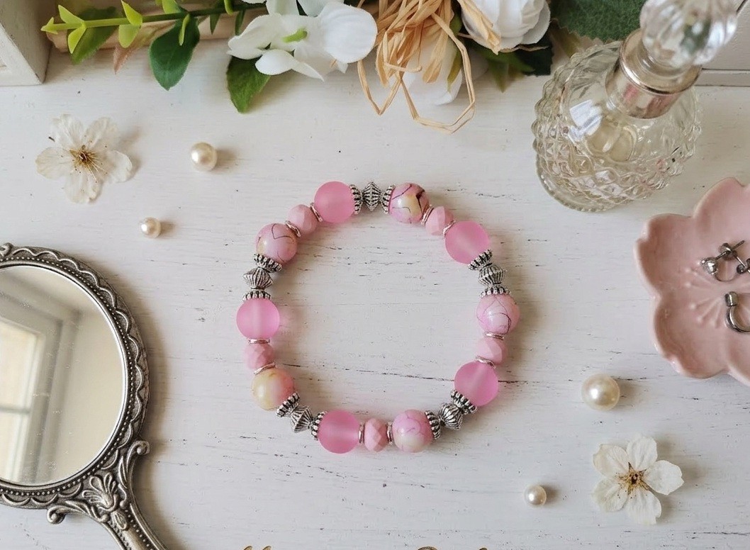 Bracelet sur fil élastique avec perles en verre givré de couleur rose, perles jade rose tréfilé et apprêts de couleur argent mat