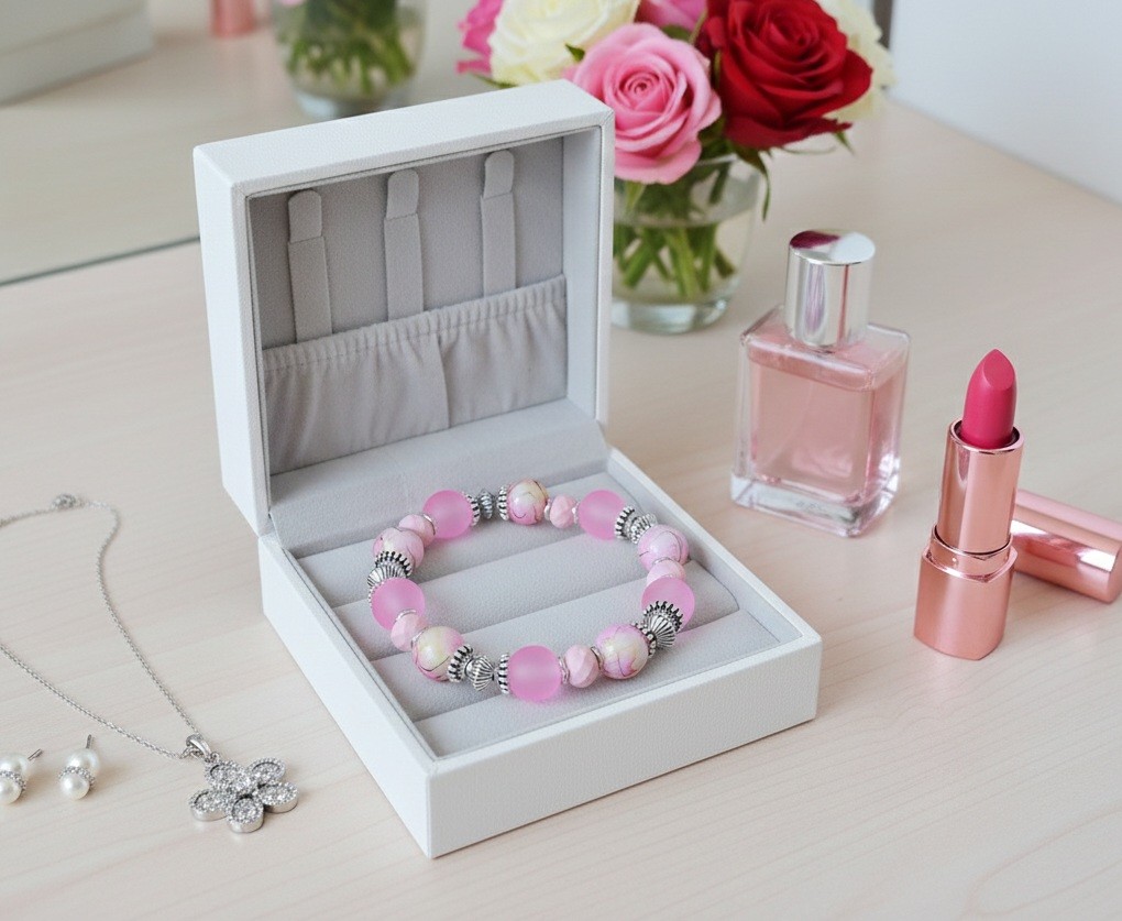 Bracelet fil élastique perles verre rose givré et tréfilé