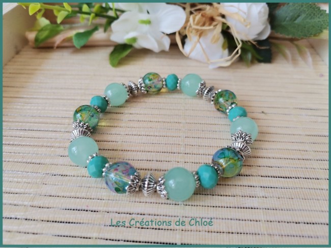 Bracelet sur fil élastique avec perles en verre et jade de couleur verte et apprêts de couleur argent mat