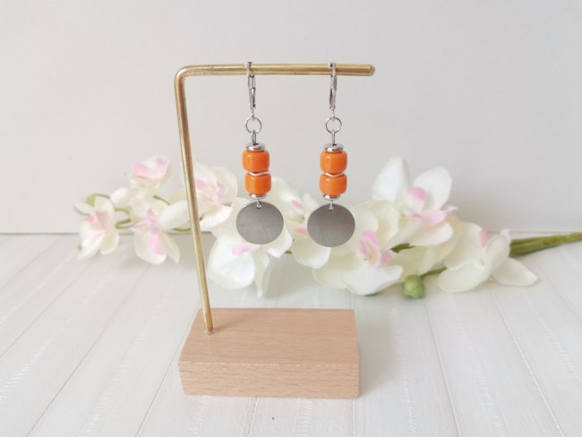 Boucles d'oreilles acier inoxydable, sequin métal et perles colonnes oranges
