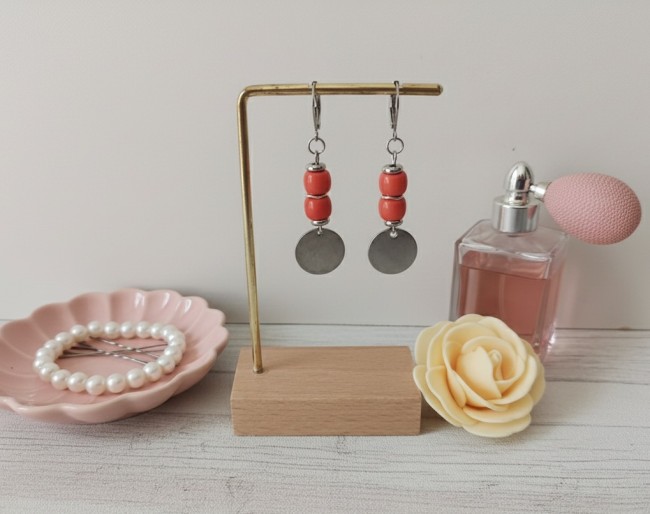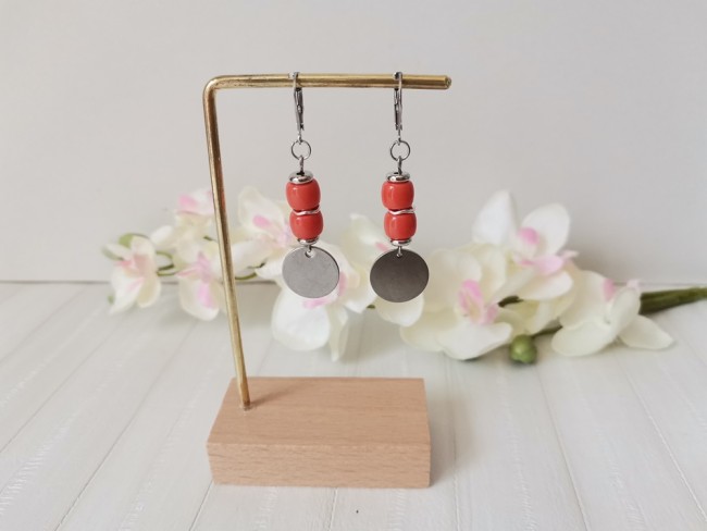 Boucles d'oreilles acier inoxydable, sequin métal et perles colonnes corail