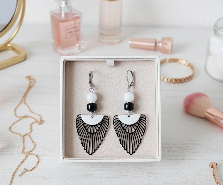 Boucles d'oreilles acier inoxydable et pendentif aile noire/sequin émail blanc