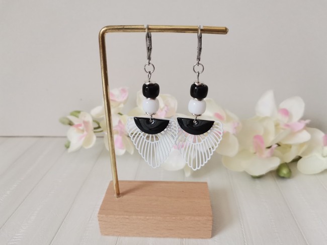 Boucles d'oreilles acier inoxydable et pendentif aile blanche sequin noir