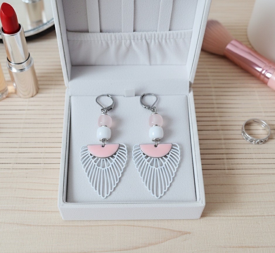 Boucles d'oreilles acier inoxydable et pendentif aile blanche sequin rose