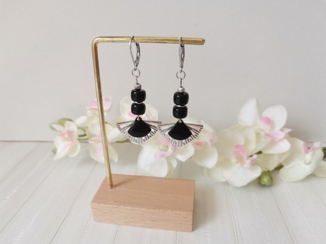 Boucles d'oreilles acier inoxydable éventail métal et émail noir